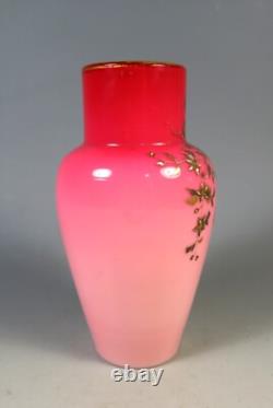 An unusual Bohemian peachblow cased glass vase by harrach c. 1880 with raised gilt & silver decoration depicting a hanging vine with flowers and berries and a beetle, finished with a gilt border around the rim. This beautiful glass vase has a polished pontil and apart from typical minor gilt wear it is in excellent condition, standing 6 inches tall.
