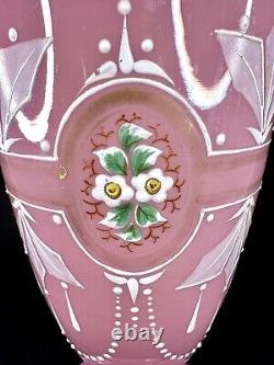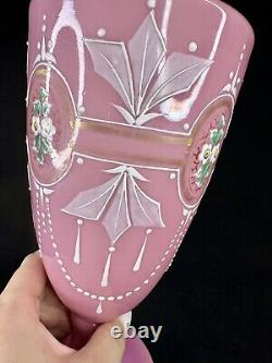 Antique Pink Opaline Glass Bristol Vase Hand Painted Floral Urn Shape Victorian. Measurements are shown on the photos. The gilding is worn down. Please note that this is a vintage item and may have some wear to it due to its age.