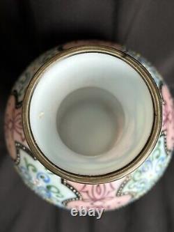 The vase is of white opaline glass, overlaid or cased with pale yellow, pink & light blue glass & then superbly hand painted with chinoiserie polychrome enamel panels - enamel scrolling arabesques in light green, pale & mid blue & white with daisy-like flowers of white, blue & orange. The shoulders of the vase have purple dot patterns & the enamelled pattern panels continue on the neck of the vase.