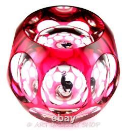 This is one of a series of hollow weights each with a different animal. The translucent pink overlay is faceted with one large top facet and 16 side facets (eight large and eight smaller facets). It is signed with a "P" signature cane on the base of the cushion.It also has its original Perthshire paper label "PERTHSHIRE PAPERWEIGHTS" on the base. Limited edition of 400 weights, of which 275 actually made. 2-3/4" height X 3-1/8" diameter.